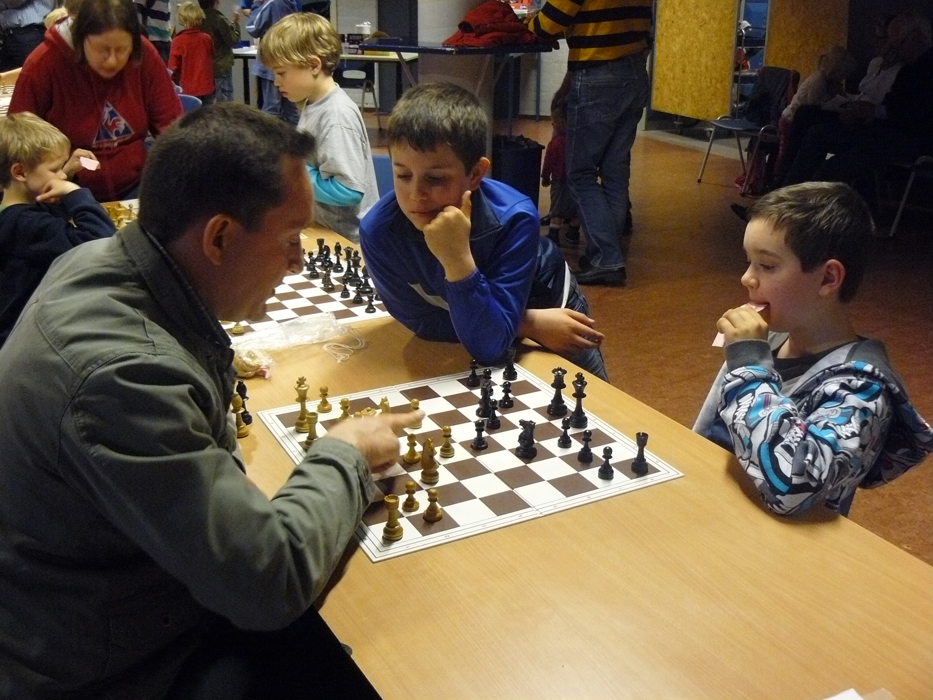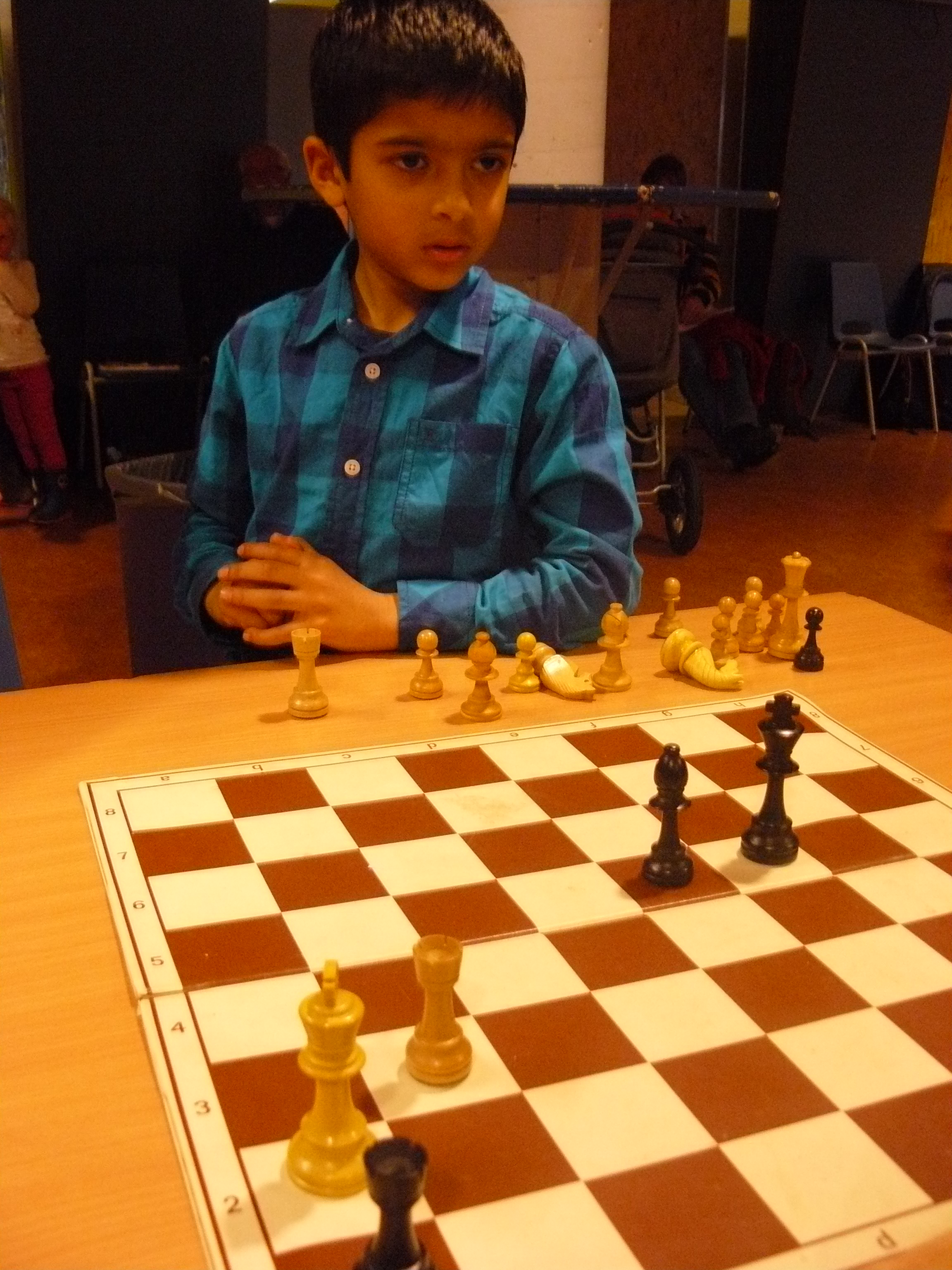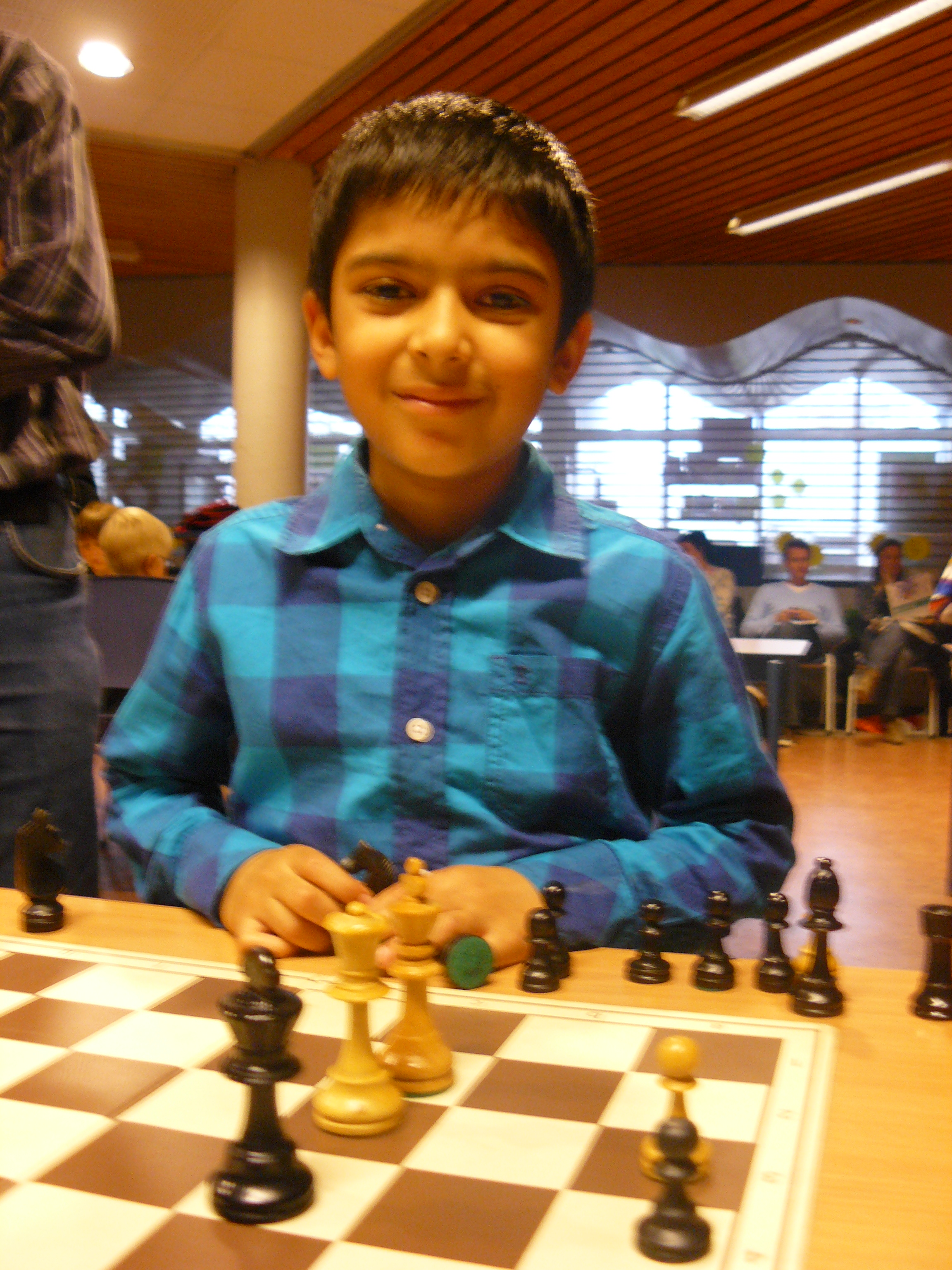 Zaterdagmiddag deden negen Pionnetjes mee aan de een na laatste Grand Prix van de HSB in Delft. En al gelijk in zijn eerste optreden wist ons nieuwe pionnetje Saad grote indruk te maken. Acht partijtjes won hij op rij en dat niet alleen, hij zette bijna iedereen mat alsof het de gewoonste zaak van de wereld was. Maar zijn laatste tegenstander kon het ook. Saad verloor nog een potje en besloot met remise. Heel opvallend voor deze kleine pion is dat hij al behoorlijk de spelregels kent en zijn tegenstanders daar ook regelmatig (indien nodig met hulp van de arbiter) op wijst. Ja, eerlijk is eerlijk. Saad schaakt ook op school (de Piramide) met veel oudere kinderen en leert wel van zich afbijten. Dat levert hem nu heel wat puntjes op. Grappig detail is dat zelfs de tafelleider af en toe behoorlijk onder de indruk was. Je kon het van zijn gezicht af lezen.