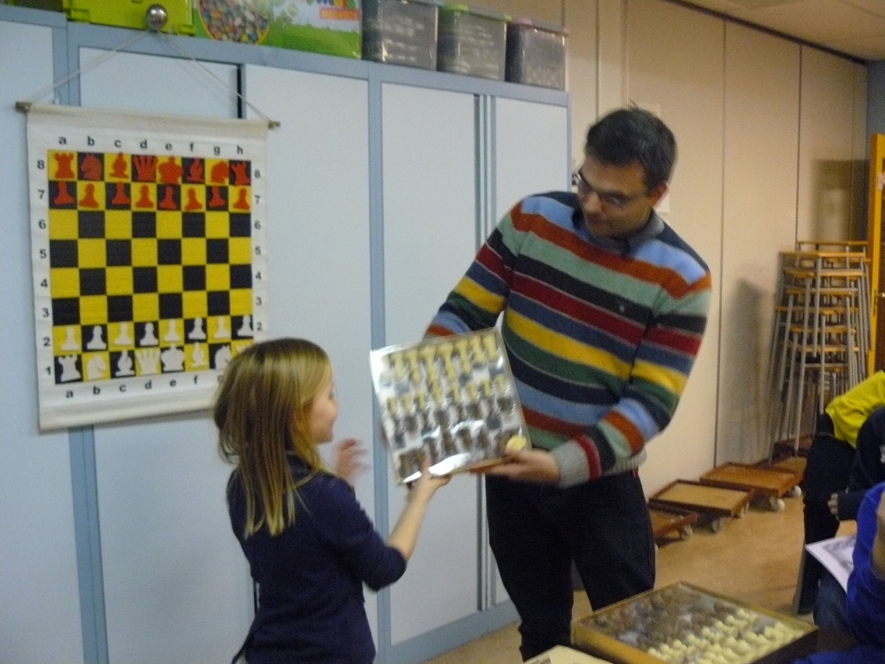 Al een paar weken proberen diverse pionnetjes Mark te onttronen als chocoprins van 2011. Hij verkocht toen de meeste loten van de ‘Grote Clubactie’. Uit de opbrengsten kon het bestuur van de club nieuwe borden bekostigen. Vandaag bleek Dana over groot handelstalent en doorzettingsvermogen te beschikken. Zij verkocht maar liefst 30 loten en mocht zich daarom onze nieuwe chocodame noemen. Een schaakspel van chocolade stukken werd haar deel. Een handelstalentje in de dop. Elk geslagen stuk mag dus ook echt gegeten worden. Resteert de vraag: Met wie gaat ze die partij spelen? Meester Frank heeft zich al aangemeld en schijnt ook (naar verluid) een goede kans te maken.