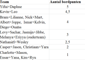 Na een zware eerste dag en een goed herstel op de tweede dag, speelde onze C-team op zaterdag 11 november de 5e en 6e ronde op het Nederlands kampioenschap. Helaas waren Voorschoten en Purmerend net een maatje te groot voor ons team. Diego hield in beide wedstrijden wel de eer hoog door eerst remise te spelen en vervolgens te winnen.