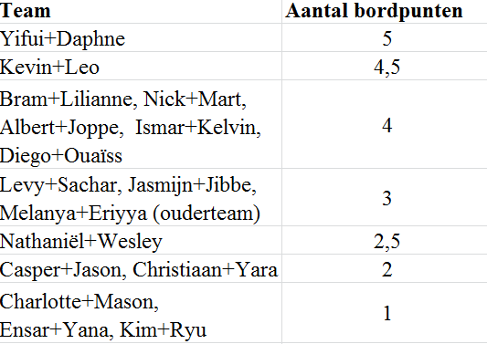 Na een zware eerste dag en een goed herstel op de tweede dag, speelde onze C-team op zaterdag 11 november de 5e en 6e ronde op het Nederlands kampioenschap. Helaas waren Voorschoten en Purmerend net een maatje te groot voor ons team. Diego hield in beide wedstrijden wel de eer hoog door eerst remise te spelen en vervolgens te winnen.