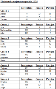 Hieronder de eindstand van de competitie en ladder van de voorafgaande periode: de competitie en ladder van het voorjaar van 2025.